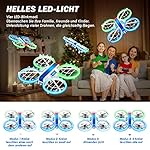 【Coole Beleuchtung】Die vier Rahmen des Mini-Quadcopters sind mit ultrahellen grünen und blauen LED-Lichtern ausgestattet, um die Drohne bei Tag und Nacht zu blenden. Sie können den Himmel mit einer schönen und lustigen Lichtshow erleuchten, um die Aufmerksamkeit aller auf sich zu ziehen.